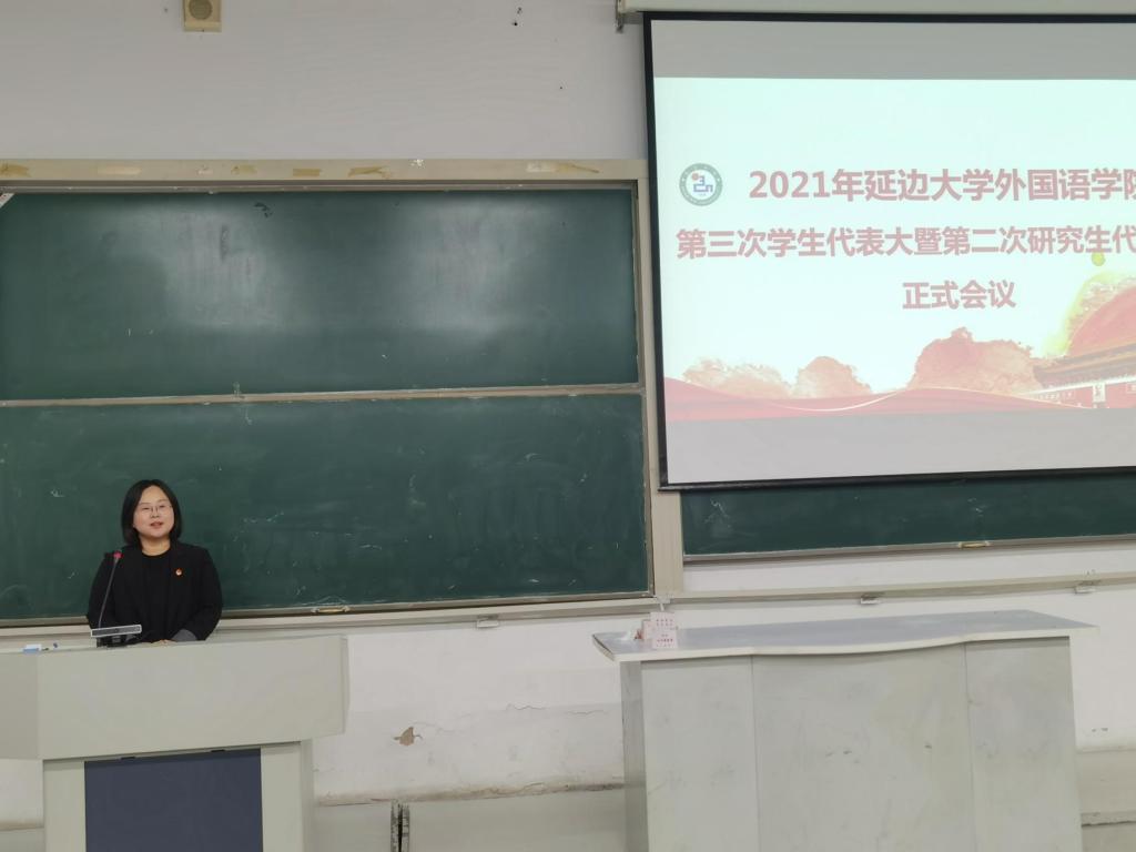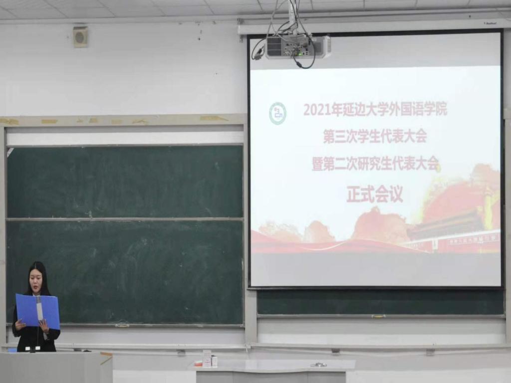 党委书记全永男、学院学生工作办公室主任金春宪、学院团委书记郭鲜丹、学院团委副书记兼研究生辅导员金兰以及各团总支书记出席了本次大会。来自延吉校区和珲春校区各团支部的本专科生及研究生代表共计128人参加了本次大会,其中珲春校区的代表通过腾讯会议线上参会。大会由澳门银河