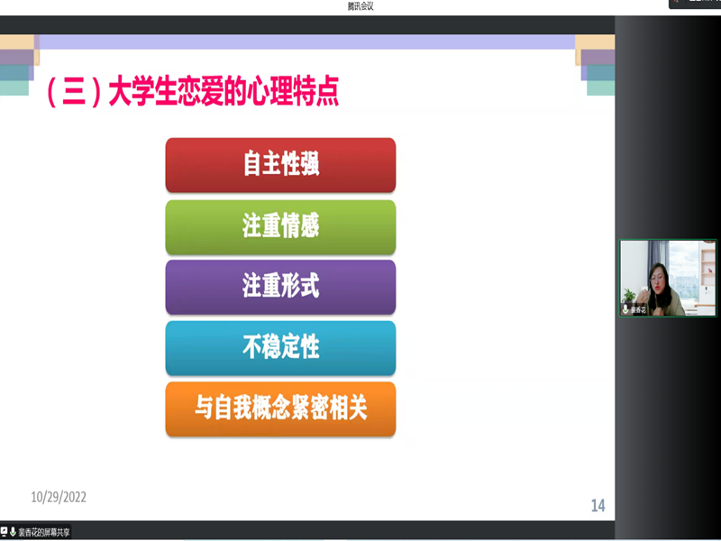 裴香花老师首先向新生们普及了正确的恋爱观念、大学生恋爱爱的心理特点和常见的恋爱心理问题。随后,针对大学生对恋爱知识的欠缺以及容易出现的误解,裴老师从心理学角度系统的讲解了爱情的含义、实质和发展阶段及心理过程,向同学们提供正确应对心理挫折和情感危机的解决方案。讲座结束时,裴香花老师寄语新生,希望同学们学会爱自己、爱他人、理解爱情、树立正确的恋爱观,并以积极向上的健康心态投入到大学生活中。