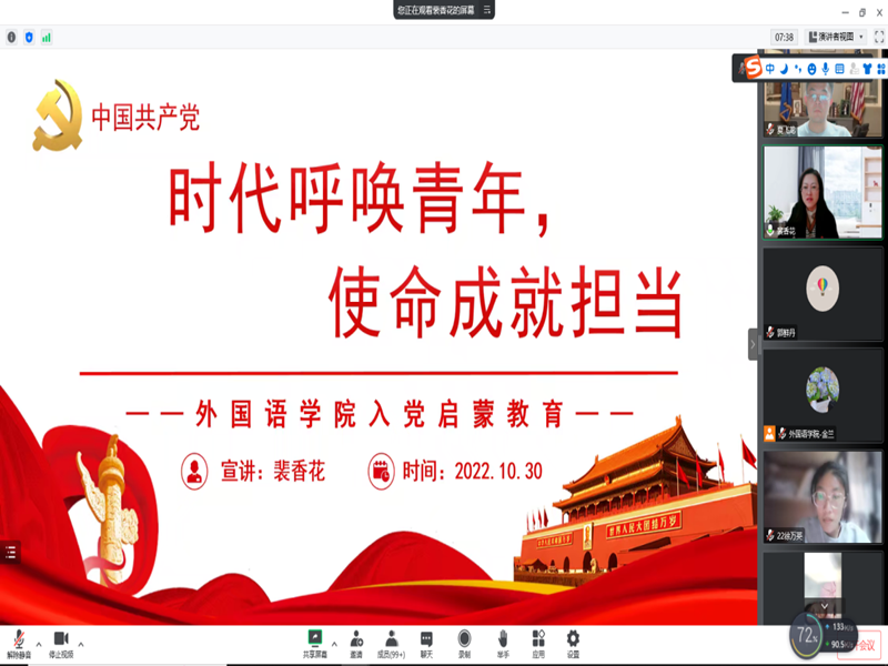 裴香花书记结合外国语专业学生特点,充分调动了新生对了解党、认识党与加入党的兴趣与向往,营造了积极良好的讲座氛围。紧接着,裴书记通过中国共产党是什么、中国共产党干什么、新征程上青年担当的使命以及怎样才能入党四个环节,详细地介绍了党的基础理论知识。讲座最后,裴书记鼓励新生,树立正确的信仰,呼应时代的号召,担负起时代的使命,积极靠拢党组织,为早日成为一名优秀的中国共产党党员而努力。同时,呼吁澳门银河