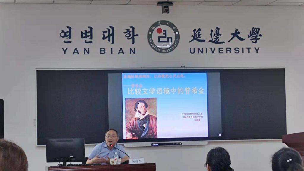 7日上午9点,吴教授在融合楼229会议室以“比较文学语境中的普希金”为题进行讲座。吴教授首先以钱钟书先生对中俄文学的互文研究切入,指出比较文学的研究意义。其次,借由对普希金诗歌的文本阐释,他说明了普希金对俄国文学在世界文学中地位确立的重要意义。最后,吴教授既从影响研究的视角力证了普希金的作品与欧洲文学的互文现象,又以普希金与中国文学的平行研究阐析了中国学界对普希金的理解与接受。讲座后,吴教授与在场师生热切互动,对外国文学研究与俄罗斯文学研究的进一步展开提出宝贵意见。