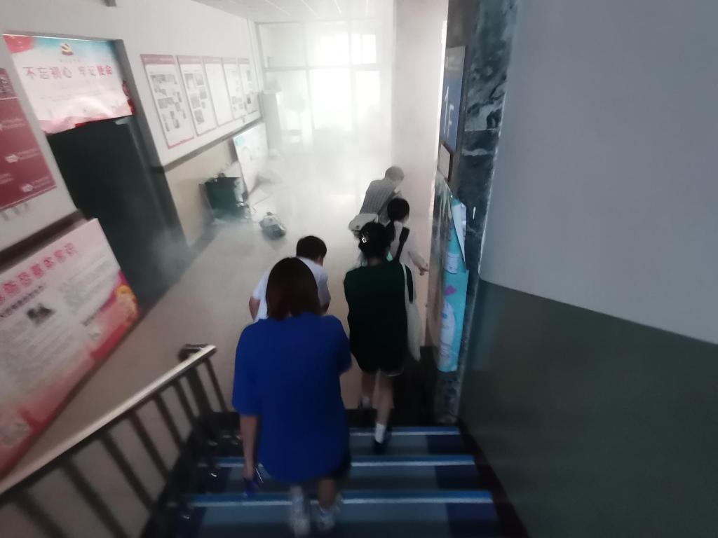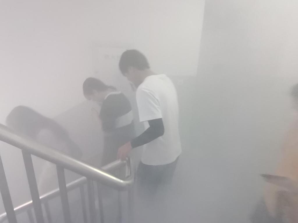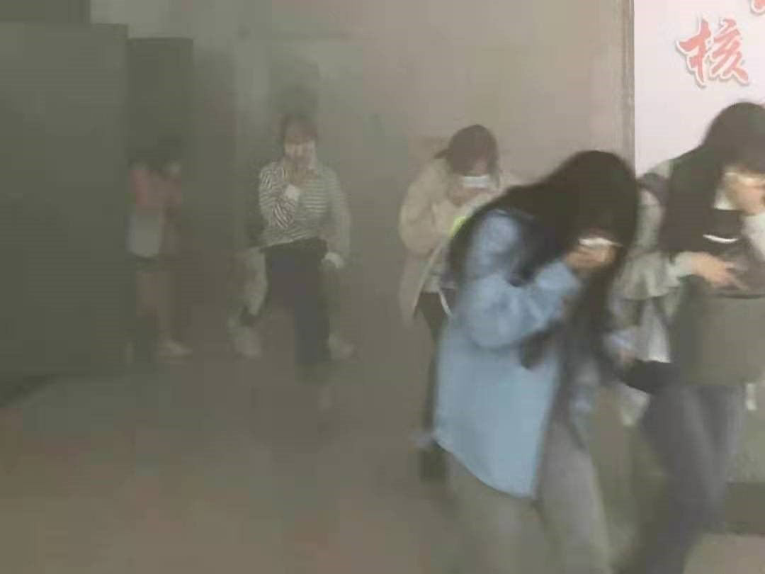 演练开始前,学院学工办主任金春宪老师进行了动员讲话,他强调了本次消防安全演练的重要性,嘱咐同学们要注意个人安全。随着烟雾弹的发出,疏散演练正式开始。同学们严格按照要求,弯下身子、用毛巾捂住口鼻,各楼层负责人积极协助学生队伍快速有序撤离。整个过程有条不紊,合作默契,快速地完成了疏散,最后在指定安全区域完成了集合。