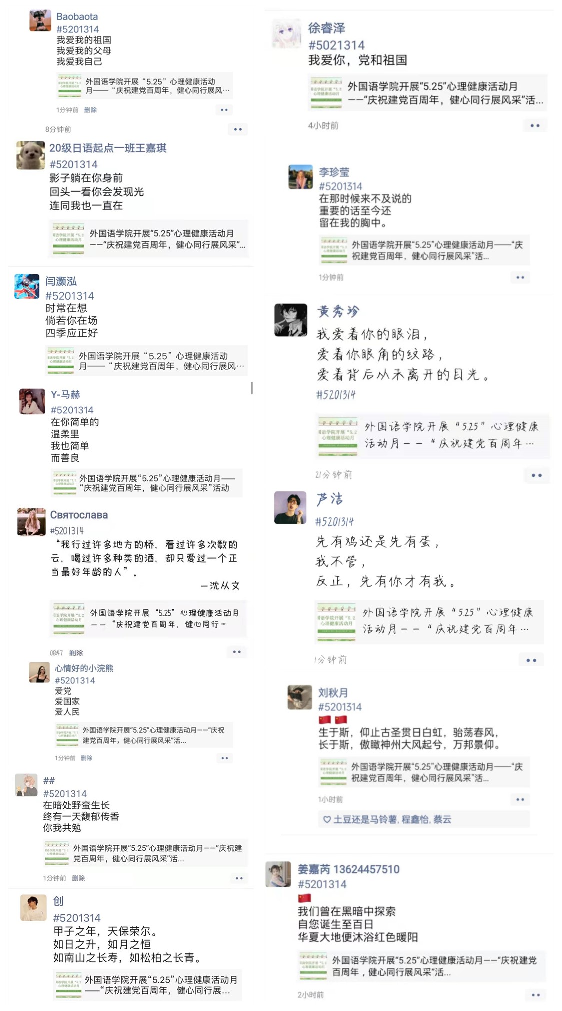 心理健康教育,广泛宣传与普及心理健康知识,我院特此举办“5.25”心理健康活动月——“庆祝建党百周年,健心同行展风采”系列活动之“5201314”朋友圈话题接力。