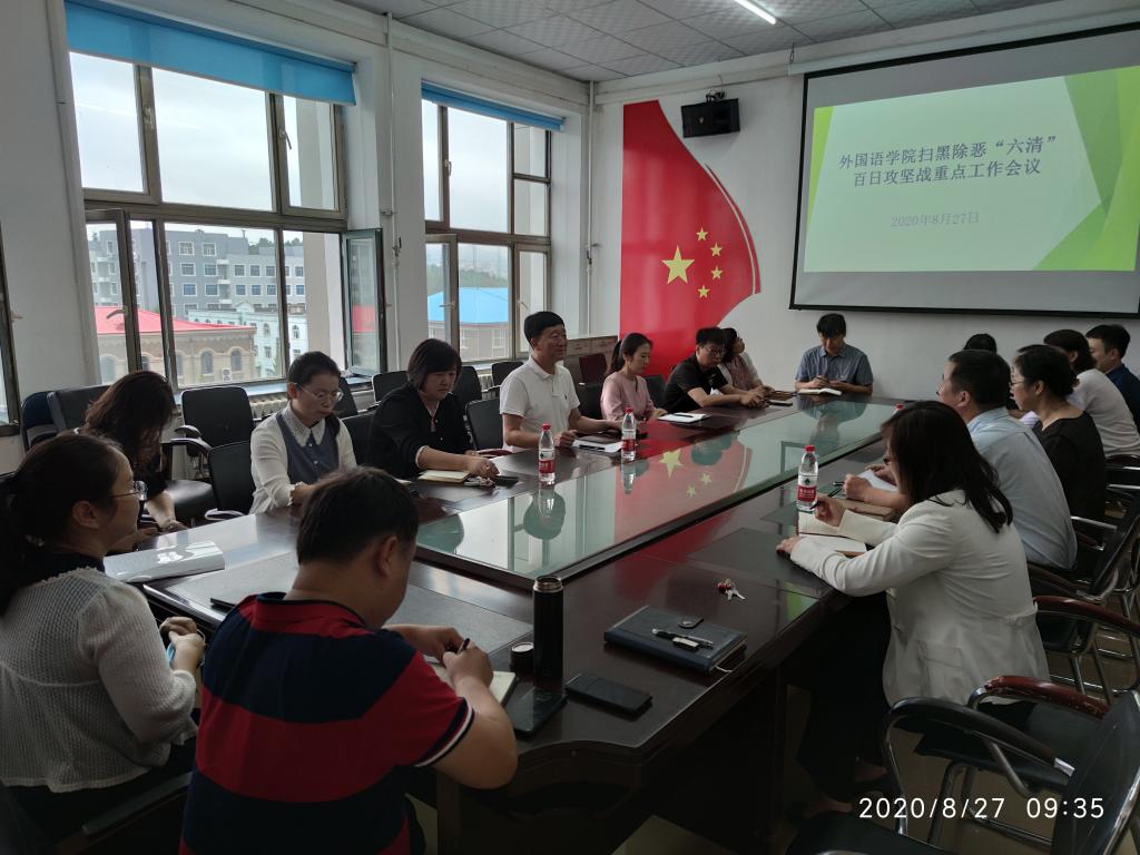 调研扫黑除恶专项斗争工作。学院党委书记全永男、院长朴玉明、副书记裴香花、党办、院办、教科办、学工办、团委、各专业及大学外语部相关负责人参与调研会议。